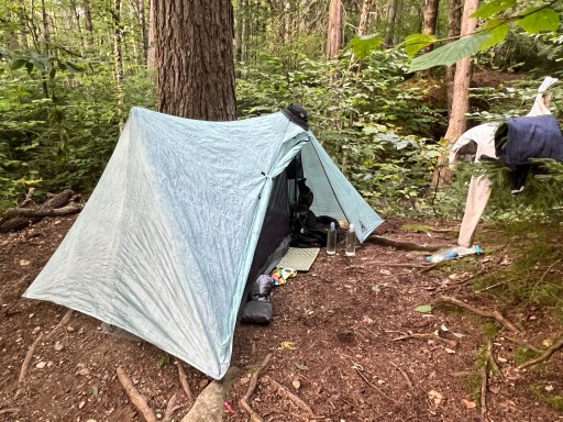 I squeezed onto a spot and managed to lay my sleeping pad on flat-ish ground although the edges of the tent are pretty close to rocks and are staked at odd angles.