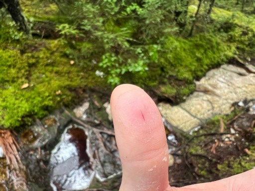On my way down from Old Blue I felt a stinging pain on my left thumb. Turns out because of the rain the hands are shedding a layer of skin and they got dry enough that the skin broke open from being so dry. I’m going to pick up some vasoline when I got into town next. For now I’ll use chapstick.
