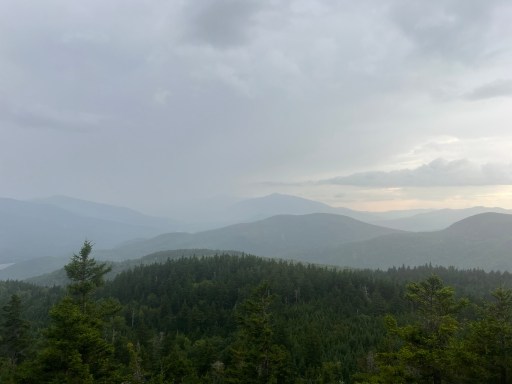 There was a little bit of thunder and it seemed to be further away. I think we’re just getting the edge of the storm and the rain would go from light to heavy for a few seconds at a time. Evan though it was raining the views were still fairly clear. I got a view towards the presidential range from Wocket Ledge.