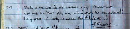 I really didn’t want to hike 3 more miles today as it was already 6:20 and I had hiked a ton today already. I looked at comments on FarOut and found a few possible sites about a mile down the trail. I loaded up with water and headed that way. I didn’t check the log books here because they were all busy serving dinner.