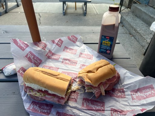 As we made our way through the town (Dalton) we passed by a lot of old brick buildings and some old manufacturing plants. When we walked up to Levardi’s he was sweeping the front porch. There a bunch of old hiking poles around a post with two white blazes on it. He’s got a hiker box, outlets, log, and menus of local restaurants. Kill Bill and I talked with him for a while before setting up camp. We both decided to go to Angelina’s Sub Shop down the street. I got a 12inch itialian sub and a quart of chocolate milk. It was some of the freshest bread I’ve had in a long time.
