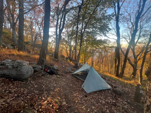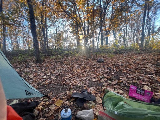 I eventually made it to the shelter and there were a couple of weekend hikers here already. I went up the hill a bit to a few tent pads. Most were pretty slanted but I found one with a flat spot. It’s got a good view though the trees into the valley below.