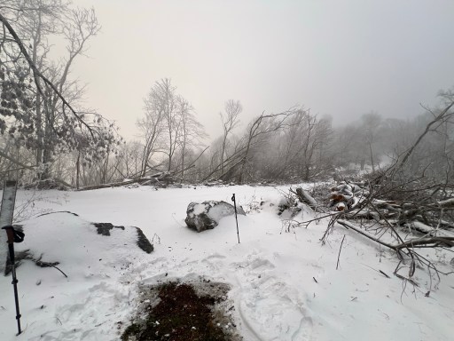 When I was low enough the fog (or clouds) had cleared and I was able to see across the valley. The neighboring ridge was filled with blowdowns highlighted by the snow. It’s so interesting how spotty and patternless the blowdown fields are.