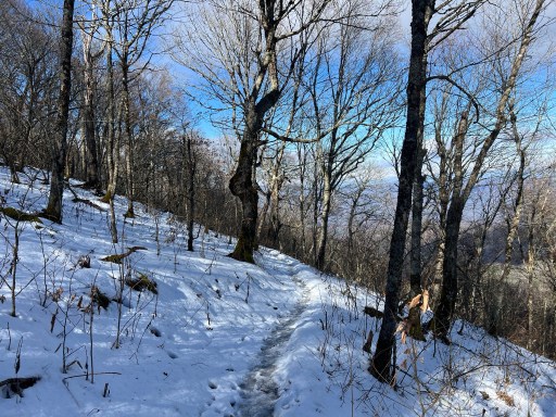 The hike down from Big Bald was pretty slow. Because people have walked on it during the previous days the layer of snow has been compacted and refrozen into a layer of ice. I was sliding all around but managed not to fall.