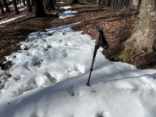 The higher I got the more snow that was unmelted. Today’s high is 65 and I’m wearing shorts walking through snow. Doesn’t seem right. Unfortunately the snows heavy and wet so my shoes are soaked.
