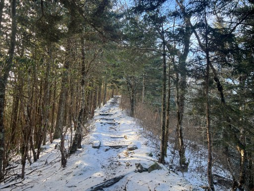 Up next was a 900 ft climb to a trail intersection with some flat trail just before it. Took a short snack break before continuing on to the 1600ft climb where I’ll have lunch. All these climbs are a steady incline that keeps the same grade nearly the whole time making it easy to pace myself. After a big chunk I got a view through some rhododendron. It was at this point where there was a dusting of snow along the trail that hadn’t melted yet.