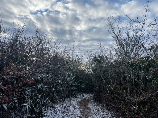After that little break, I walked to Silers Bald. I had a few views towards it before I reached it. It was interesting to see how the trees would be frosted on one side of the ridge and not on the other. I had snow falling on me every time a breeze came through.