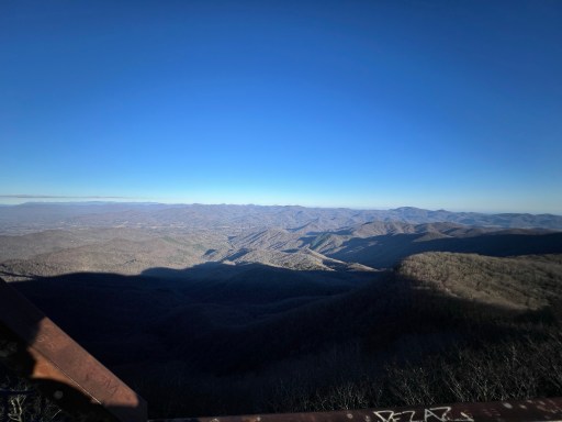 I continued through the rododendron up 1200ft to Albert Mountain. There’s a large fire tower at the top! I climbed all the way up to the hatch and tried to open it. It budged but didn’t open. I tried a few more times with no luck. It was a bit odd because I couldn’t see any visible lock. I managed with the view from the uppermost staircase. Still wonderful!