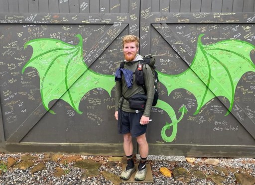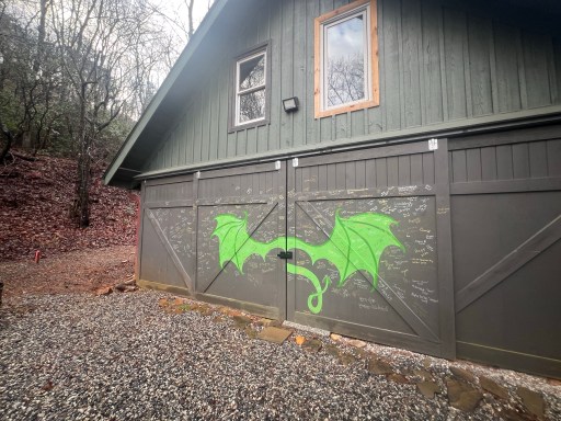 At 9 Bill drove me back to Dick’s Creek Gap. But first I signed the garage and got a picture with the green dragon wings. The hostel is Lord of the Rings themed. They are also doing some short video interviews picking the brains of thru hikers. We made a short one on our drive back to the trailhead.